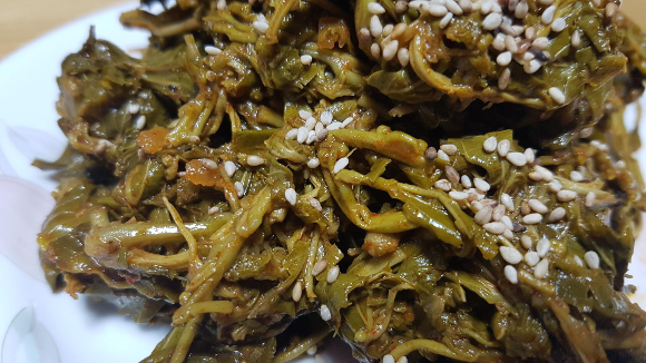 손으로 물기를 꼭 짠 후 고추장, 마늘, 참기름, 간장, 깨소금을 넣고 무쳐먹는다.