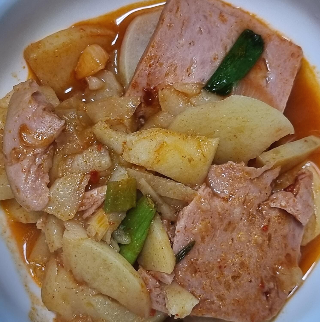 - 햄이나 스팸을 잘게 으깨며 햄을 국물에 잘 녹게 한다.
