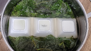 - 깻잎에 잘 녹인 소금물을 부은 후 뜨지 않도록 무거운 돌이나 그릇으로 눌러놓는다.