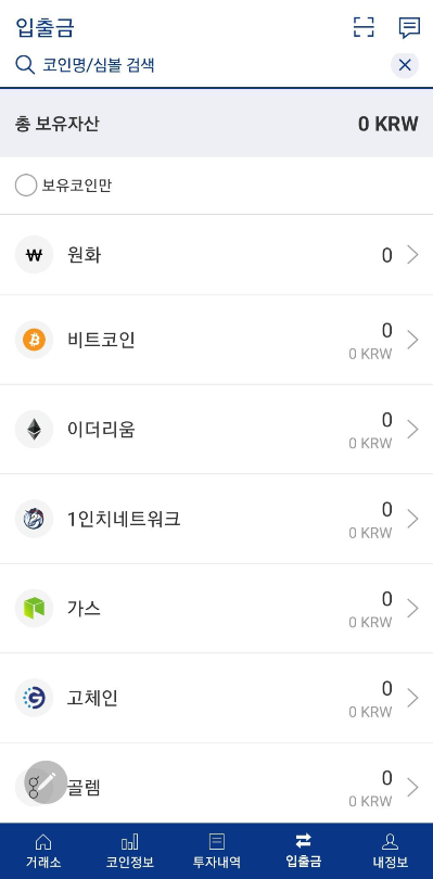입출금은 원화와 비트코인, 이더리움을 포함하여 가상활페리스트가 나타나면 보유 자산을 확인할 수 있다.