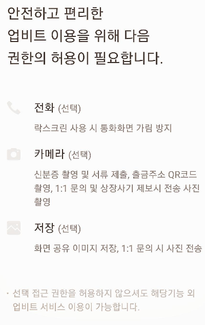 락스크린 사용시 통화화면 가림방지와 신분증등 제출서류에 필요한 카메라, 화면공유 이미지저장이나 문의시 사진전송에 필요한 저장 권한을 허용하는것을 선택할 수 있다.