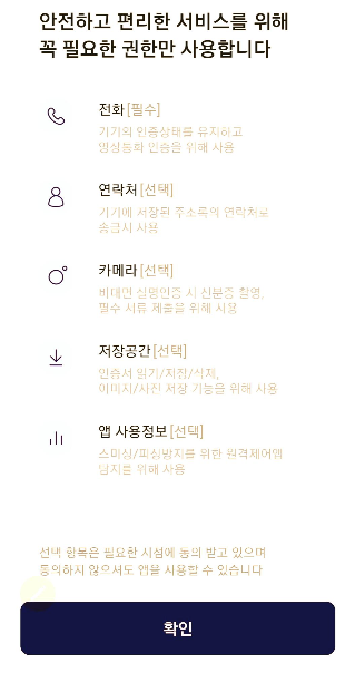 본인인증을 위한 전화, 신분증 스캔등록을 위한 카메라등의 권한을 허용해야 막힘없이 가입을 할 수 있다.