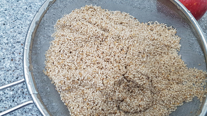 씻는 참깨를 체에 받쳐놓아 물기를 뺀다.