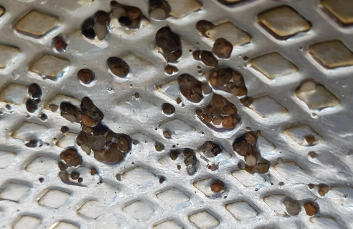 이걸 억지로 떼러면 정신적 스트라이크가 오므로 체는 후라이팬 위에 엎어놓으면 마르면서 참깨가 떨어진다.