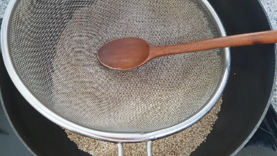 볶는 과정 초반에는 물기가 많기때문에 체를 엎어놓고 있어도 깨가 타지않는다.