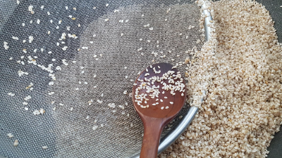 국산참깨는 쌀씻는 그릇에 담아 물을 붓고 체에 다시 붓는다.