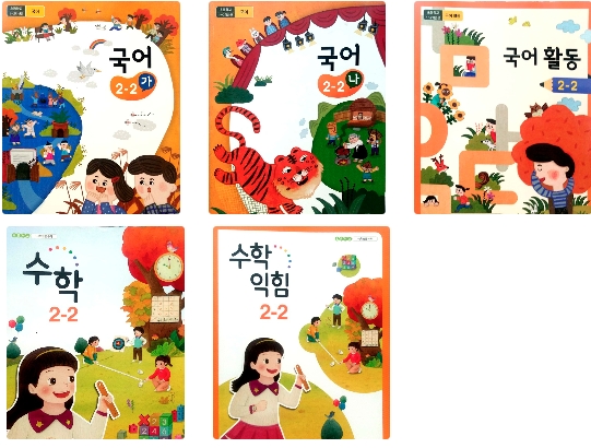 국어 2권(가,나) 국어활동, 수학, 수학익힘의 5권이 주 과목이다.
