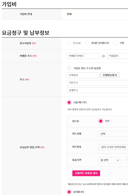 이메일주소와 주소, 요금납부 방법을 선택한다.