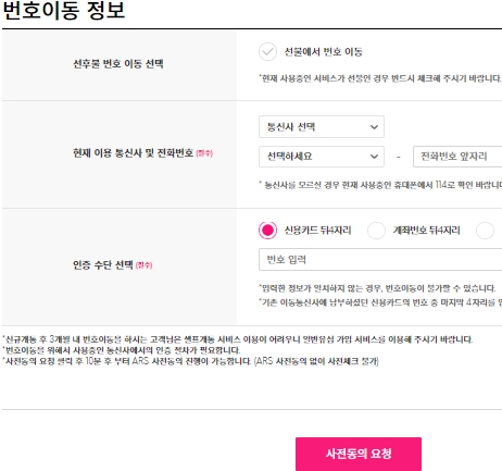 사전동의 요청을 누르면 핸드폰으로 문자가 오고 링크 문서의 번호이동 승인을 해야한다.