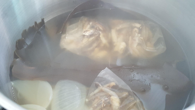 4. 큰 냄비에 만들어놓은 멸치다시백, 다시마, 무(양파), 파를 넣고 끓인다.