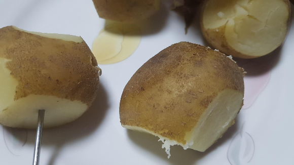 감자를 찔때 껍질을 벗기면 맛이 덜하다.